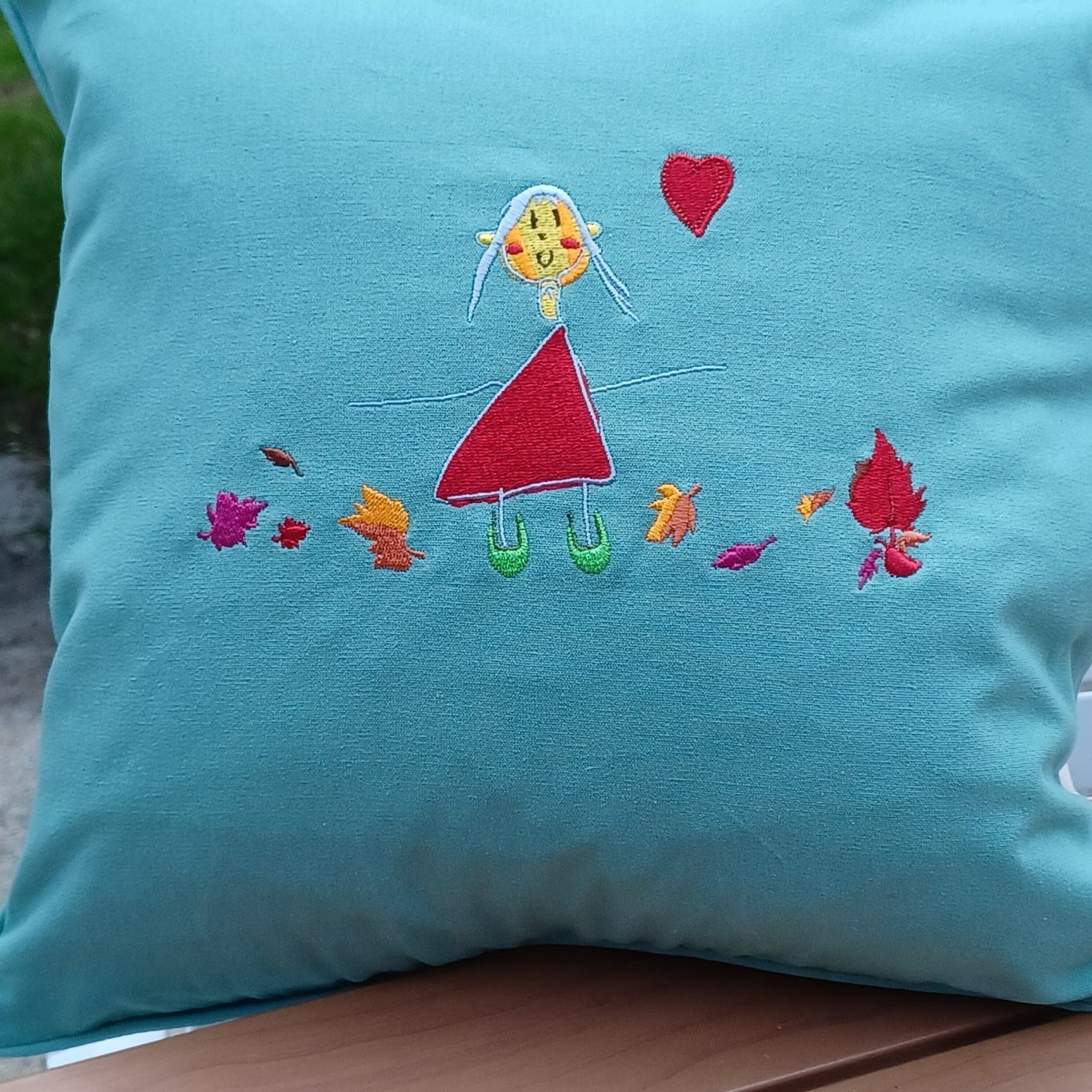 Broderie sur coussin effectuée à partir d'un dessin d'enfant. Retrouvez les sur LES BRODERIES DU PETIT PIOU