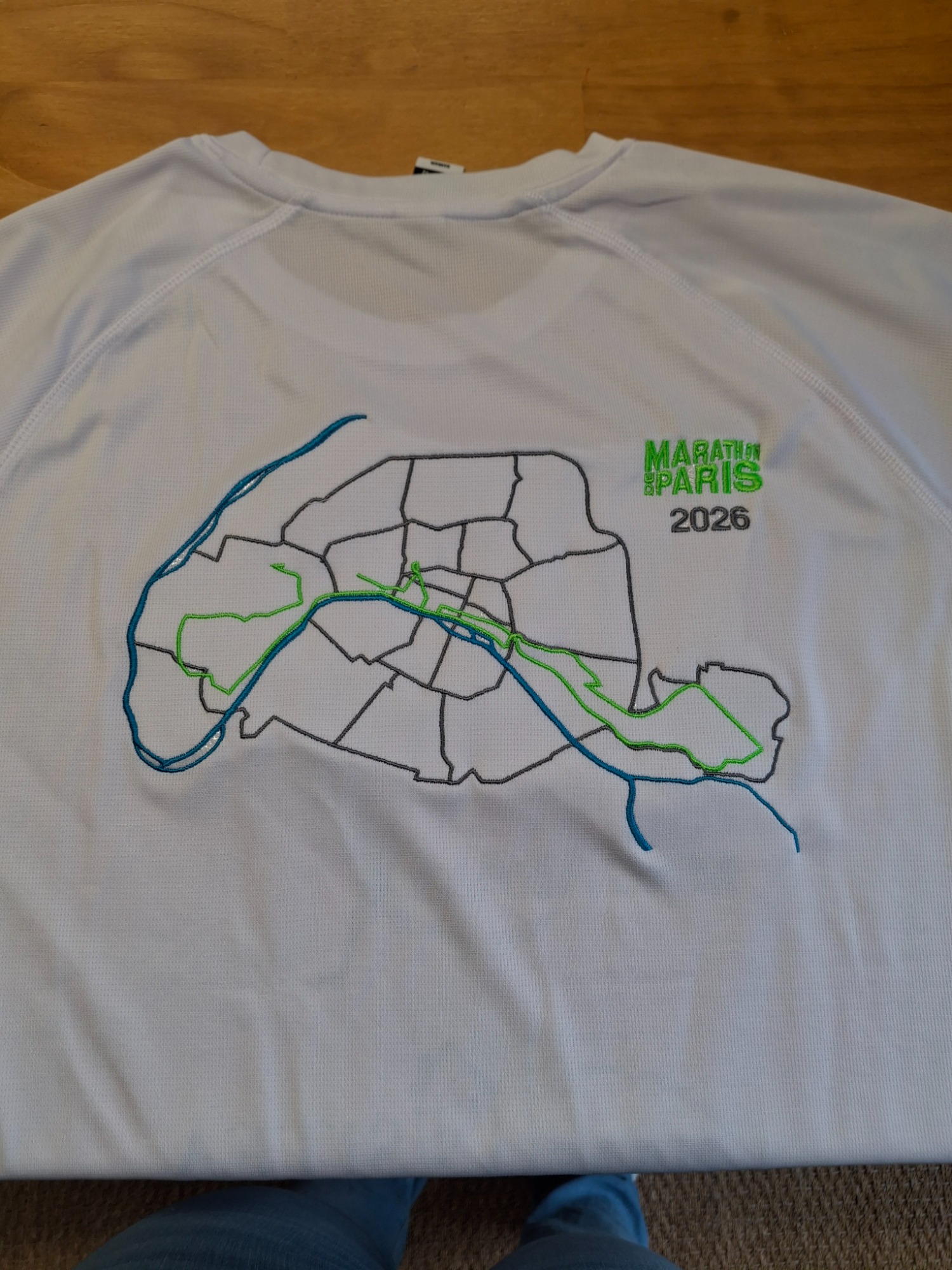 Broderie dos sur tee-shirt de running pour le marathon de Paris 2026.
